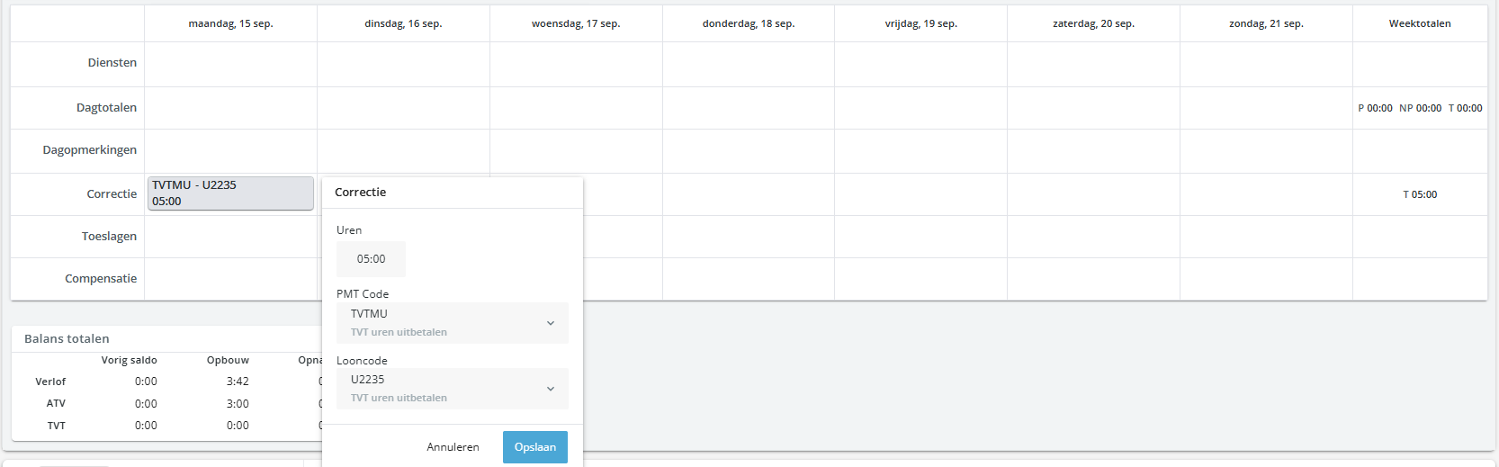 Open de correctie in kwestie die aan de medewerker is toegekend, of maak een nieuwe verlofcorrectie door op de knop Nieuwe correctie te klikken. Per type uren heb je vier opties: uitbetalen, inhouden, plus correctie en min correctie (afhankelijk van de inrichting in PMT). PMT past hierbij ook automatisch de juiste looncode toe. Als je de juiste correctie-uren hebt ingevuld, klik je op Opslaan.