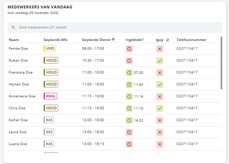 Onder de kolom Ingeklokt? zie je in één oogopslag of een medewerker op dit moment aanwezig is. Staat er een ✔️ (vinkje), dan betekent dit dat de medewerker is ingeklokt en dus aanwezig is in de winkel. Bij een ❌ (kruisje) is de medewerker niet ingeklokt. Het kruisje wordt getoond als een medewerker zijn/haar dienst wel is begonnen maar nog niet is ingeklokt of als een medewerker om wat voor rede dan ook uitklokt tijdens zijn/haar dienst. Als er geen icoon zichtbaar is, dan is de dienst nog niet begonnen. Zo zie je eenvoudig wie er al aan het werk is, wie nog moet starten en of iemand eventueel te laat is.