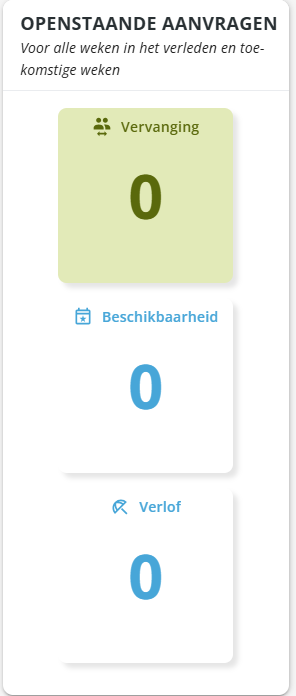 In de widget Openstaande aanvragen kun je direct op 1 van de 3 kaartjes klikken om naar de juiste pagina te gaan, zodat daar eventueel openstaande acties afgehandeld kunnen worden.