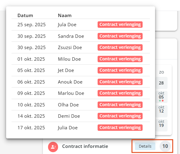 Onder de kalender staat per scenario een samenvatting van de 4 weken waar je naar kijkt. Per scenario staat er een Details-knop voor lijst met medewerkers voor wie dat scenario van toepassing is binnen de periode van 4 weken Als er bij contract informatie, Medewerker informatie of Verjaardagen 1 melding of meer is verschijnt een Details-knop om de volledige lijst te bekijken.