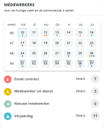 De Medewerkers-widget toont in kalenderweergave de huidige week en de drie daaropvolgende weken. Hiermee krijg je een overzicht van belangrijke gebeurtenissen rondom medewerkers, zoals: