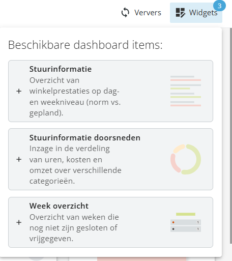 - Klik op de widget die je weer zichtbaar wilt maken. Zodra je dit hebt gedaan staat de widget weer op het dashboard, en is deze weer te schuiven of te vergroten/verkleinen naar wens.