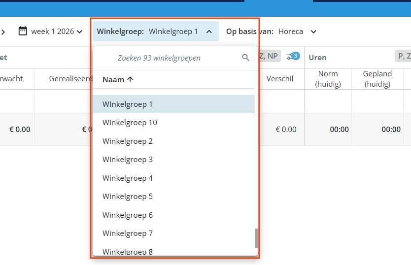Bij het openen van de pagina wordt standaard de huidige week geselecteerd. Je kunt een andere week selecteren via de week selector in de navigatiebalk. Goed om te weten: de laatste toekomstige week die je kunt selecteren is de eerste week waarin geen van de winkels in de geselecteerde winkelgroep de week heeft vrijgegeven.