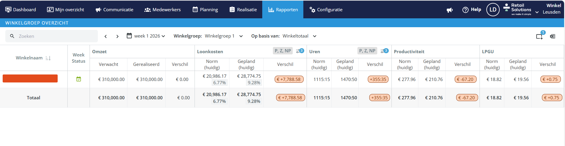 De prestaties van de winkels worden weergegeven in een tabel met de kolommen omzet, loonkosten, uren, productiviteit en LPGU. Elke sectie heeft standaardkolommen (norm (huidig), gepland (huidig) en verschil). Optioneel kunnen er kolommen worden toegevoegd; zie 'weergave instellingen'.