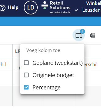 - De kolom gepland (weekstart). Deze kolom staat standaard aan, en toont de geplande waarde bij de start van de week.