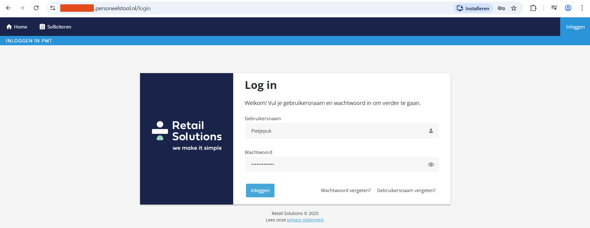 Open je browser en ga naar de URL van jouw winkel die ook te vinden is in de activatiemail. Dit is de link die eruit ziet als https://[winkelnaam].personeelstool.nl - met uiteraard jouw winkelnaam tussen de haken. Voer jouw gebruikersnaam en wachtwoord in en klik op Inloggen. Je zit nu in de webversie van PMT voor jouw winkel!