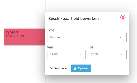 - Eenmalige beschikbaarheid – Hiermee kun je eenmalig aangeven dat je wel of niet kunt werken, bijvoorbeeld als je een keer een afspraak hebt.