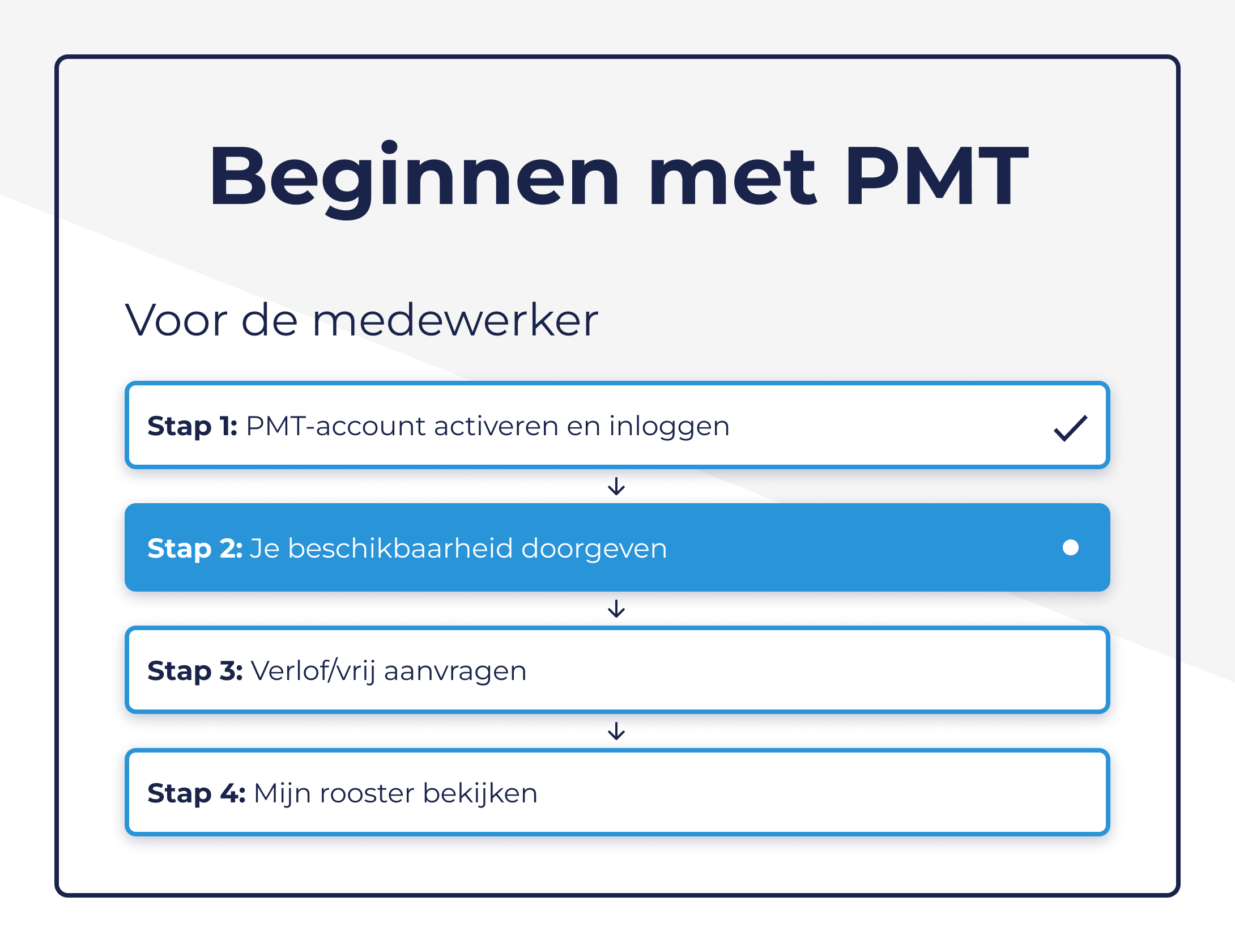Nu je bent ingelogd in PMT na Stap 1: PMT-Account activeren en inloggen, kan je door naar de volgende stap: doorgeven wanneer je kunt werken. Als je dit hebt gedaan weet jouw leidinggevende wanneer hij/zij jou wel of niet in kan plannen.