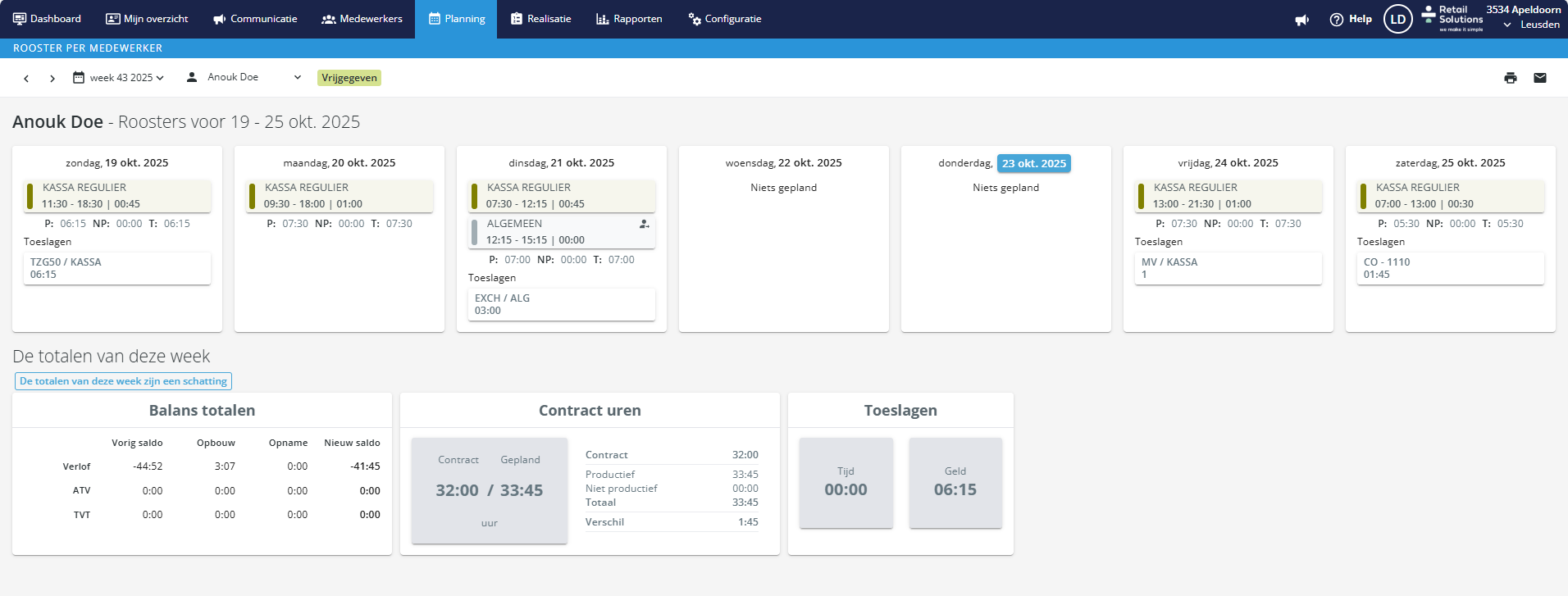 Onderaan de pagina zie je een tabel met het totaal aantal uren dat je in die week werkt. Hier zie je ook hoe die uren passen bij je contracturen.