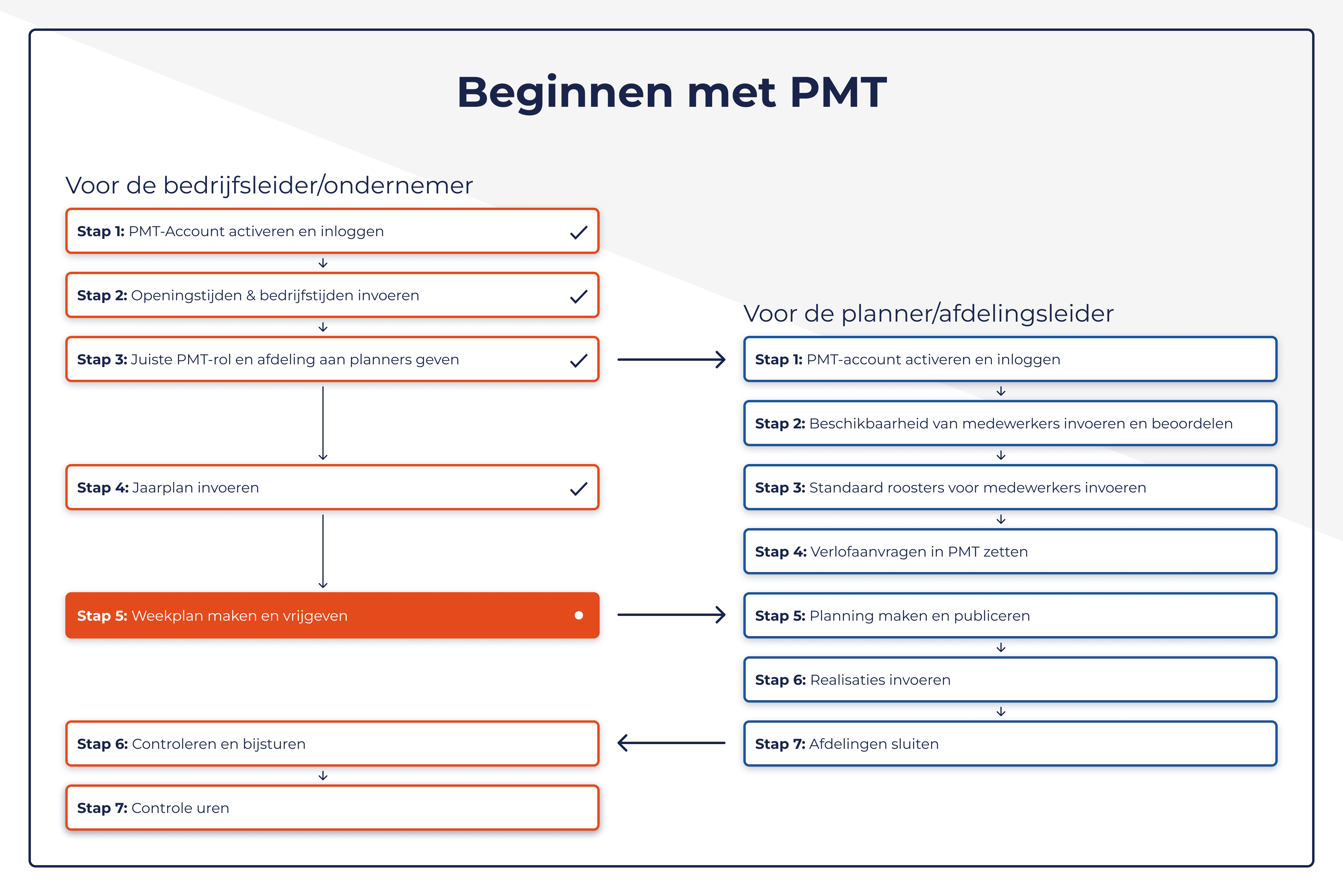 Kortom: zonder weekplan kan een planner niet beginnen aan Beginnen met PMT Voor de planner Stap 5: Planning maken. Door de week vrij te geven, open je de week voor de planners op de juiste manier, zodat zij met de juiste cijfers en normen aan de slag kunnen.
